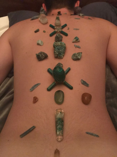 2. Balance points or Chakras are the most important focus during the second portion. The stones generally correspond in position and color to the associated chakra color. The goal is to clear blockages from the body.